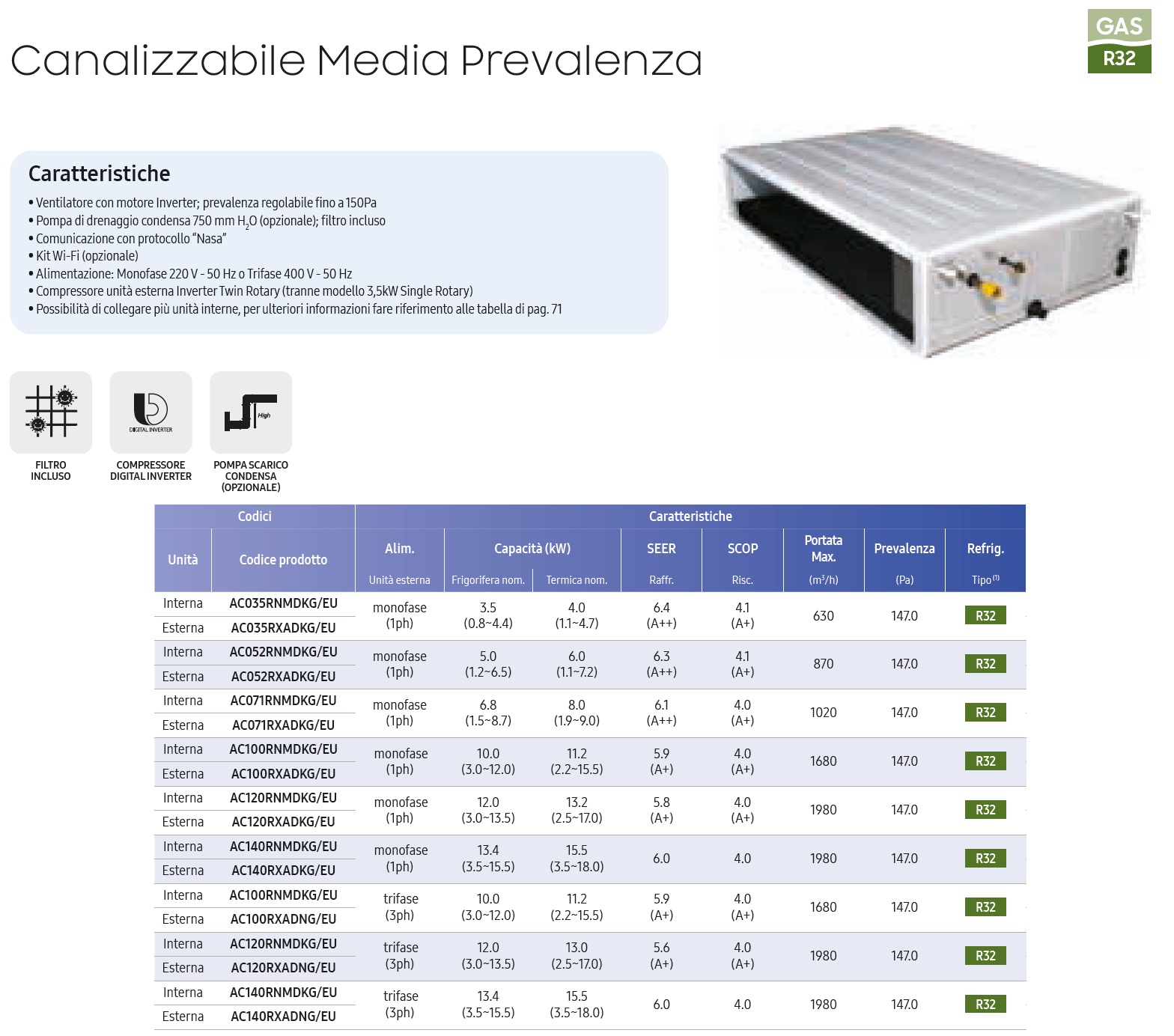 - Lüfter mit Invertermotor; einstellbare Prävalenz bis 150Pa- Kondensatablasspumpe 750 mm H2O (optional); Filter enthalten