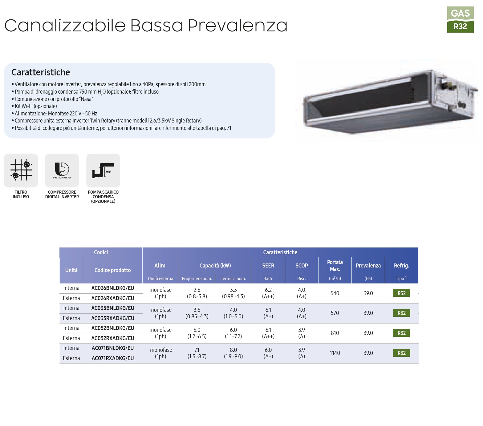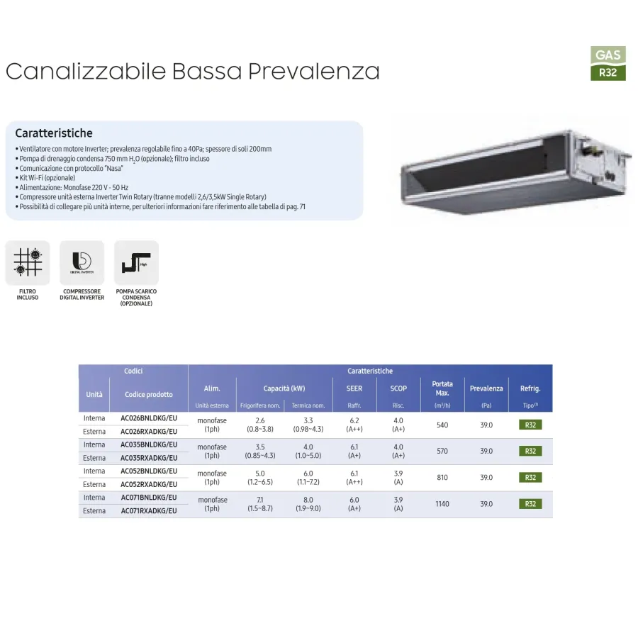 - Lüfter mit Invertermotor; einstellbare Prävalenz bis 40Pa; Dicke von nur 200mm- Kondensatablasspumpe 750 mm H2O (optional); Filter enthalten