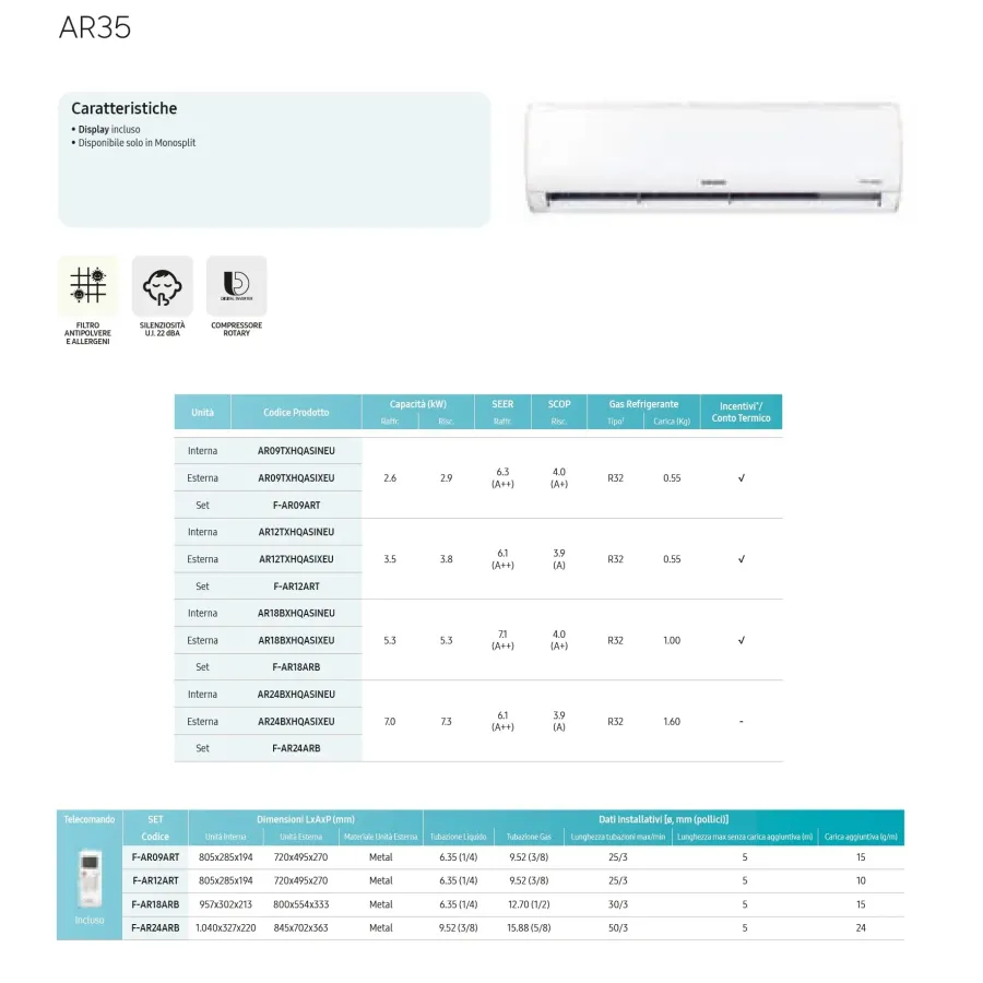 Samsung Mono Split AR35 24000 Btu AR24BXHQASINEU AR24BXHQASIXEU Klimaanlagen Weiß NO WIFI 7.0 kW R-32