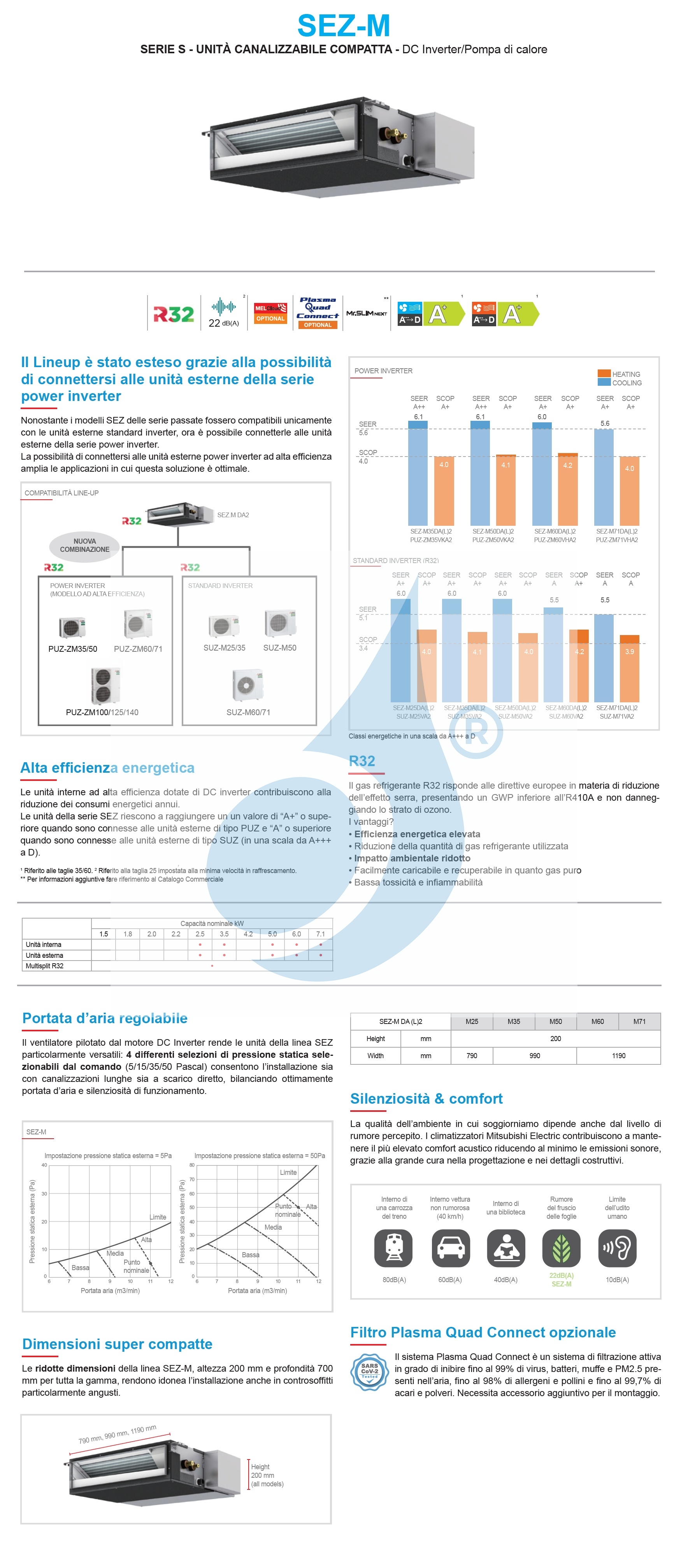 Klimaanlagen Mitsubishi Penta Split Serie SEZ-M WiFi Optional 9+9+9+9+9 Btu Inneneinheit für Mitsubishi-Klimaanlagen Mono Split- und Multi Split-Konfiguration mit Heiz- und Kühlmodus, mit Fernbedienung Wo Klimageräte nicht gesehen werden sollen, verrichten SEZ-M Kanaleinbaugeräte nahezu lautlos und unsichtbar ihre Arbeit. Die Kanalgeräte lassen sich in der Zwischendecke installieren und transportieren die konditionierte Luft über Luftblenden und Lüftungskanäle in den Raum.