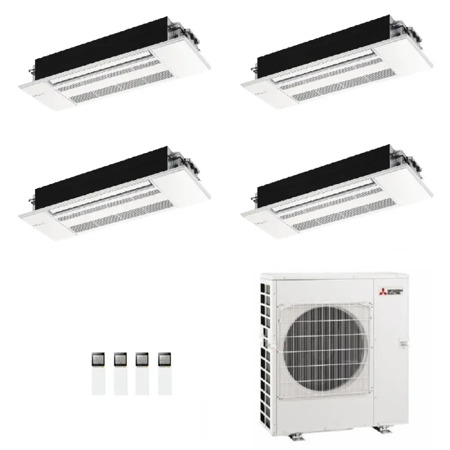 Klimaanlagen Mitsubishi Quadri Split Serie MLZ-KP WiFi Optional 9000+9000+12000+12000 Btu Inneneinheit für Mitsubishi-Klimaanlagen Mono Split- und Multi Split-Konfiguration mit Heiz- und Kühlmodus. Kassetten-Klimagerät MLZ-KP mit 1 Ausgang, hervorragend geeignet für eine Direktströmung oder kleine und beengte Räume.