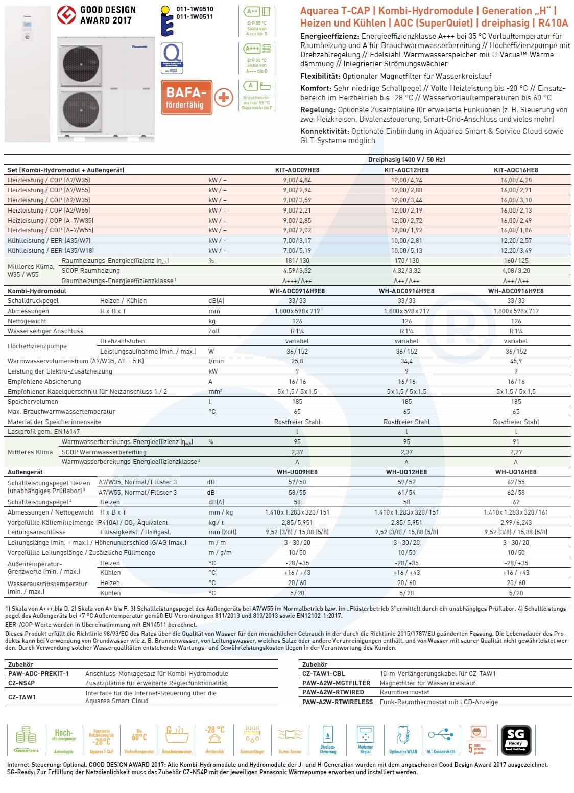 Panasonic Aquarea T-CAP Wärmepumpe KIT-AQC16HE8 16 kW 400 v R410-a SuperQuiet Kombi-Hydromodul Generation H dreiphasig