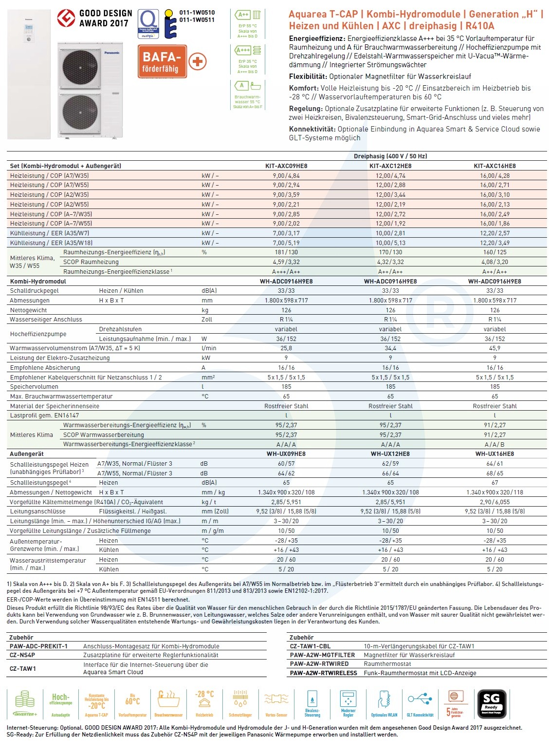 Aquarea T-CAP Kombi-Hydromodule Generation H Heizen und Kühlen AXC dreiphasig R410A